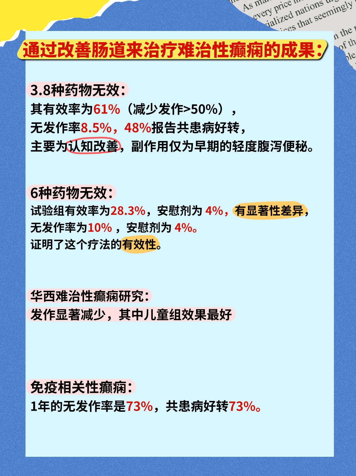 在这些小样本的临床研究基础上,2022年深圳市儿童医院的操德智主任报告了《 脆弱拟杆菌BF839辅助治疗儿童药物难治性癫痫的随机双盲对照临床研究》这一证据等级更高的临床试验,发现:对平均服用6种抗癫痫药无效的89例患者,试验组有效率为28.3%,安慰剂为 4%,有显著性差异,无发作率为10% ,安慰剂为 4%。证明了这个疗法的有效性。