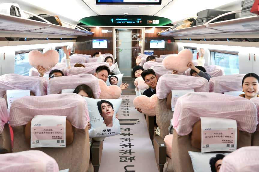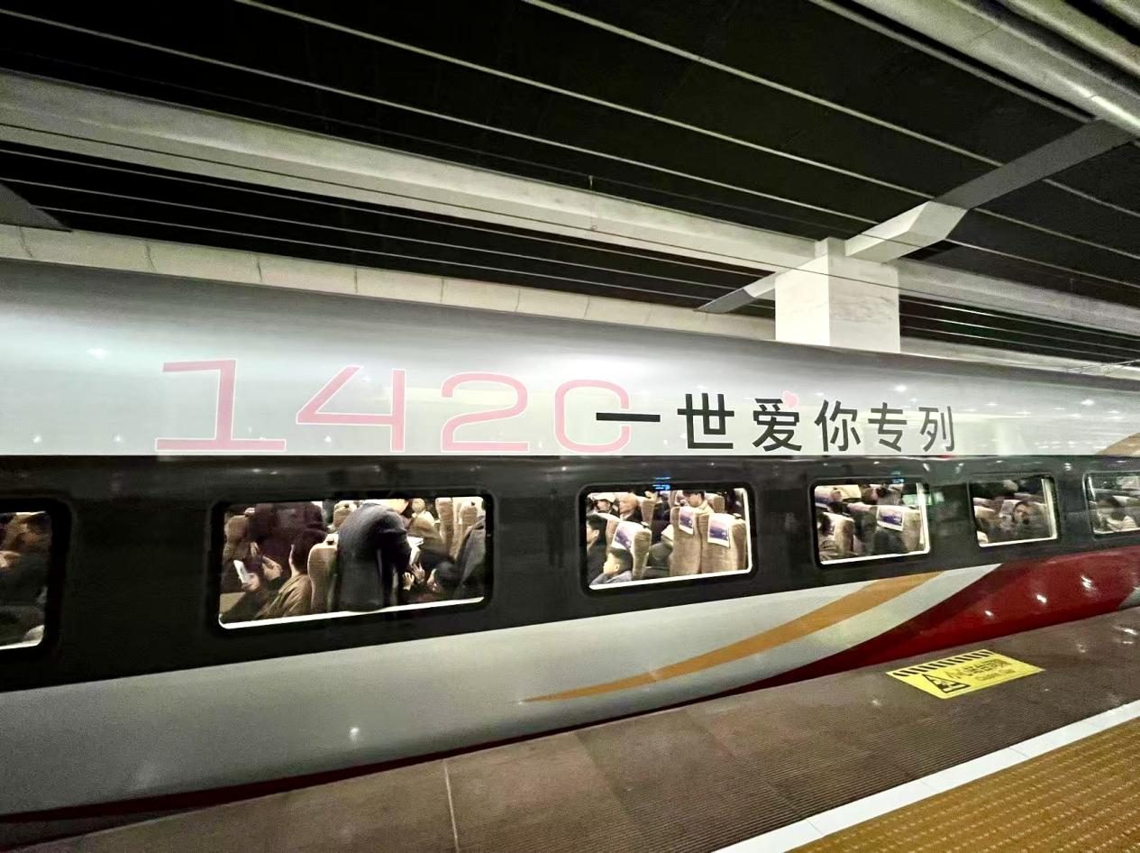 新婚夫妻在“1420一世爱你”专列上派喜糖,为归乡旅途添甜蜜
