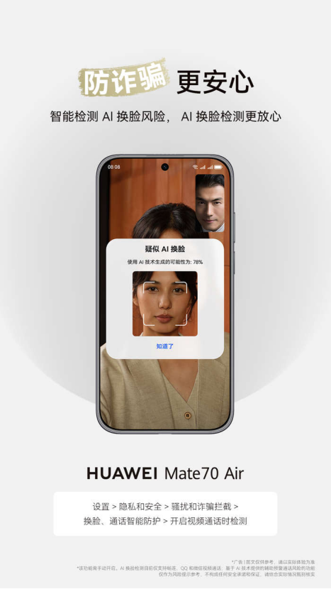 不仅如此,在鸿蒙操作系统 6的加持下,华为Mate 70 Air从系统底层构筑了更严密的安全防线,将隐私与安全防护提升到新高度——应用权限管理更精细,数据保护更彻底,让用户在大数据时代使用更安心。另外还新增AI换脸检测功能,视频通话时会智能识别画面异常,有效防范AI换脸欺诈。值得一提的是,若你家中拥有华为平板、手表、智慧屏等设备,华为Mate 70 Air均可一键互联,实现资源拖拽、通话接力、文件秒传等无缝协同,相当实用。