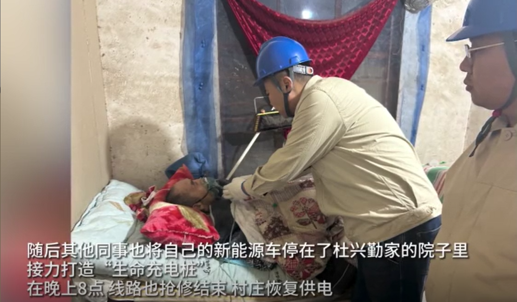 近日,江苏宿迁马厂镇一电线杆被撞断,导致附近村庄停电。1月16日,北京青年报记者了解到,马厂镇大司庄村一村民家中老人的制氧机急需用电。老人家属打电话报修后,供电公司员工卢海涛赶到现场。卢海涛回忆,当时老人状态不佳,嘴唇开始发紫,吸氧机只靠着内部电池供电运转,电量随时可能耗尽。危急关头,在同事的提醒下,决定用自己新能源汽车的外放电模式给制氧机紧急供电。看到制氧机有了电,老人家属激动得频频道谢。停电约两小时后,当晚8点,线路抢修成功,村里恢复了供电。