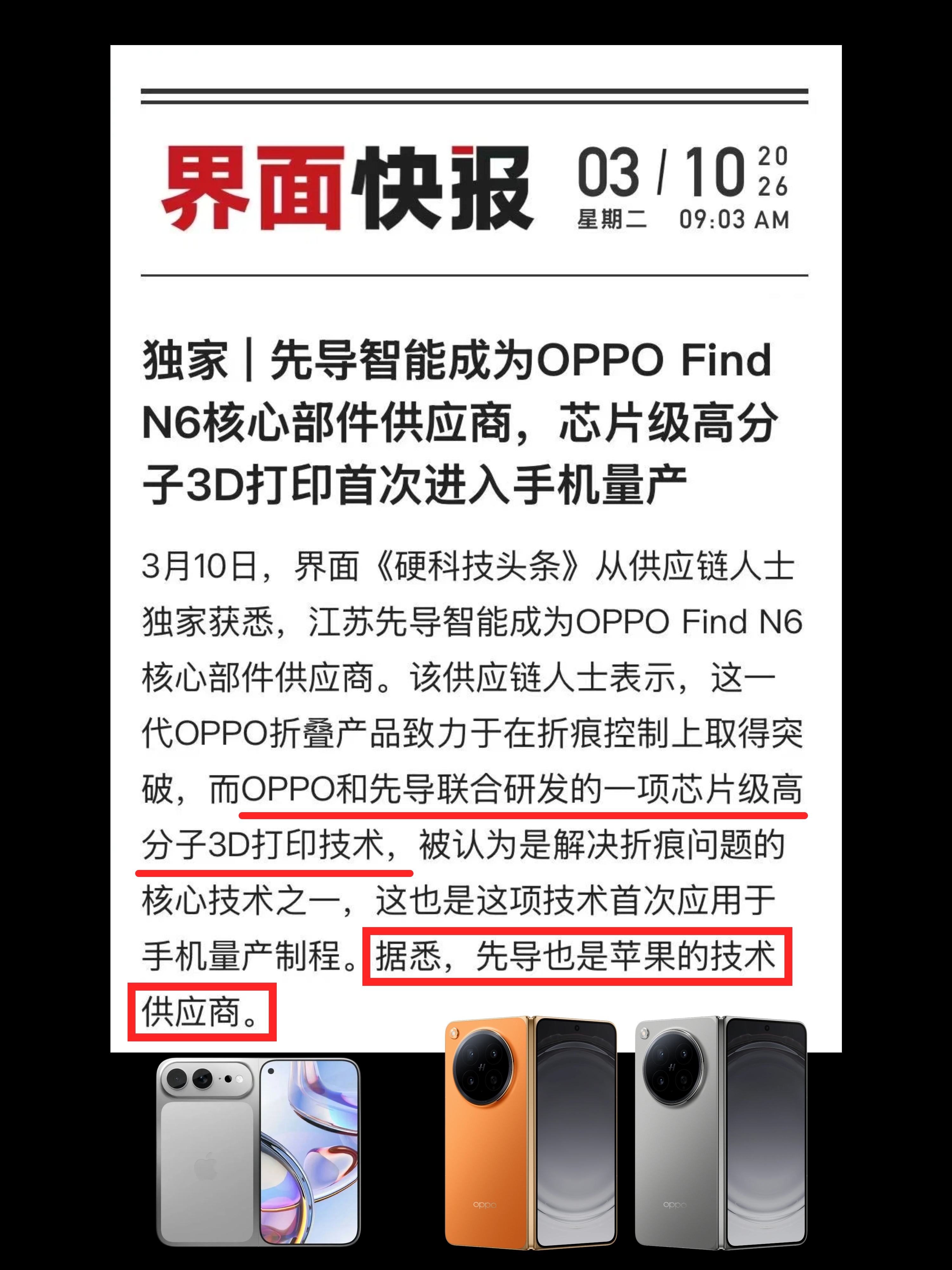 反正早上的新闻已经实锤了,“先导智能也是苹果的技术供应商”,而这次OPPO Find N6的芯片级高分子3D打印技术就是跟先导联合研发的,所以下半年的iPhone Fold想要搞定「无感折痕」的话大概率要用同源技术方案~