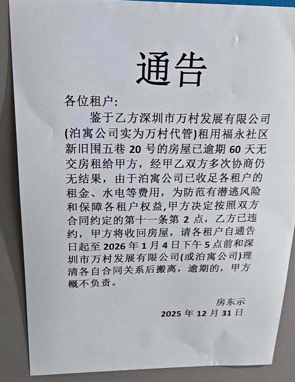 从网上的一些公告也能看出,基本都是因为公寓方未能按时把原先约定好的租金交付给房东。