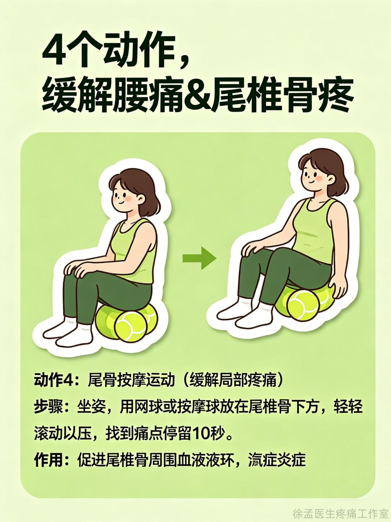 步骤:坐姿,用网球或按摩球放在尾椎骨下方,轻轻滚动按压,找到痛点停留10秒;