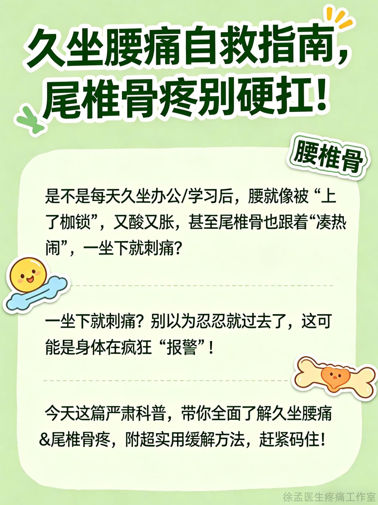大家是不是每天久坐办公/学习后,腰就像被“上了枷锁”,又酸又胀,甚至尾椎骨也跟着“凑热闹”,一坐下就刺痛?别以为忍忍就过去了,这可能是身体在疯狂“报警”!今天这篇严肃科普,带你全面了解久坐腰痛&尾椎骨疼,附超实用缓解方法,赶紧码住!