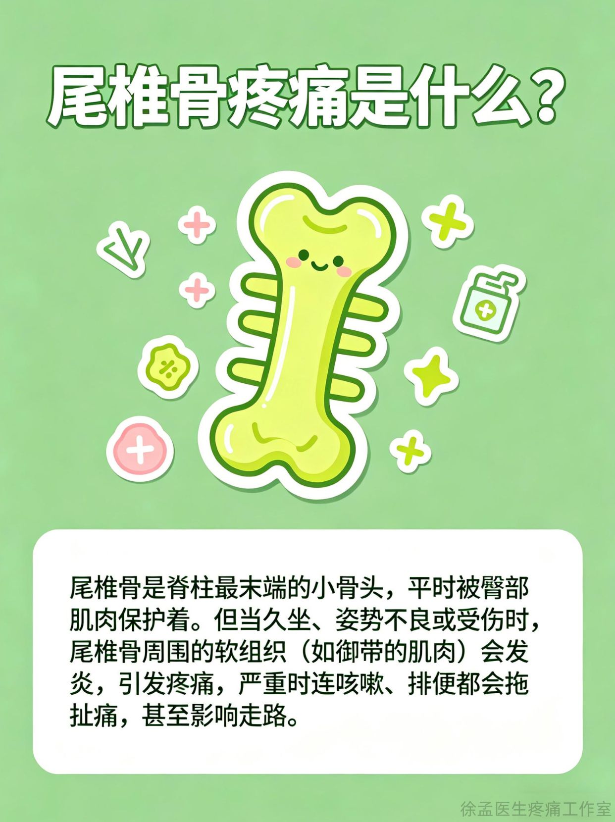 尾椎骨是脊柱最末端的小骨头,平时被臀部肌肉保护着。但当久坐、姿势不良或受伤时,尾椎骨周围的软组织(如韧带、肌肉)会发炎,引发疼痛,严重时连咳嗽、排便都会牵扯痛,甚至影响走路!