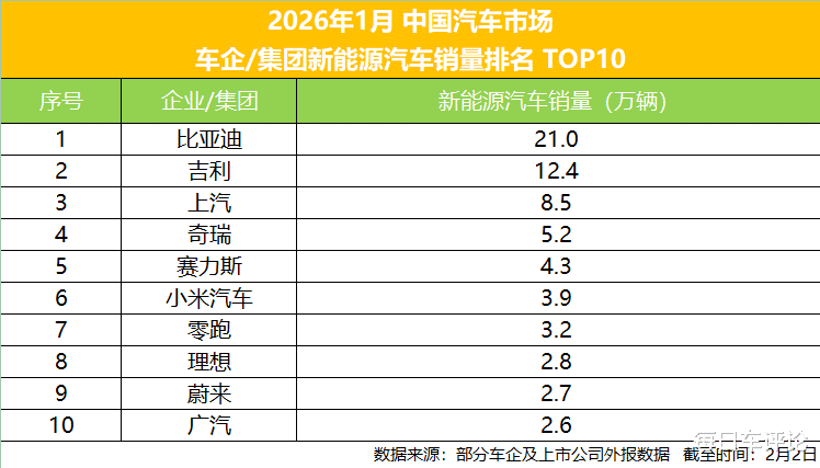 2026年伊始,各大车企已经开启了新一年的比拼,都在暗暗较劲,希望能够在新的一年开个好头,从官方公布的一月份新能源销量排行榜单来看,头部车企之间的差距已然在悄无声息中拉开。从这份销量排行榜中可以看出比亚迪的领先地位依旧无可撼动,它以超21万辆的新能源汽车销量位居行业首位,稳坐新能源汽车销冠,同时遥遥领先于其他车企。