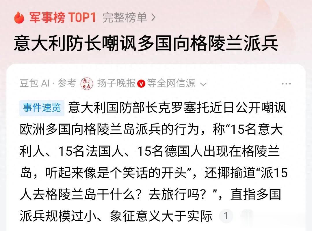 “派15个人去格陵兰岛干什么?去旅行吗?” 近日,意大利国防部长圭多·克罗塞托一番犀利吐槽,瞬间引爆全球舆论。他所嘲讽的