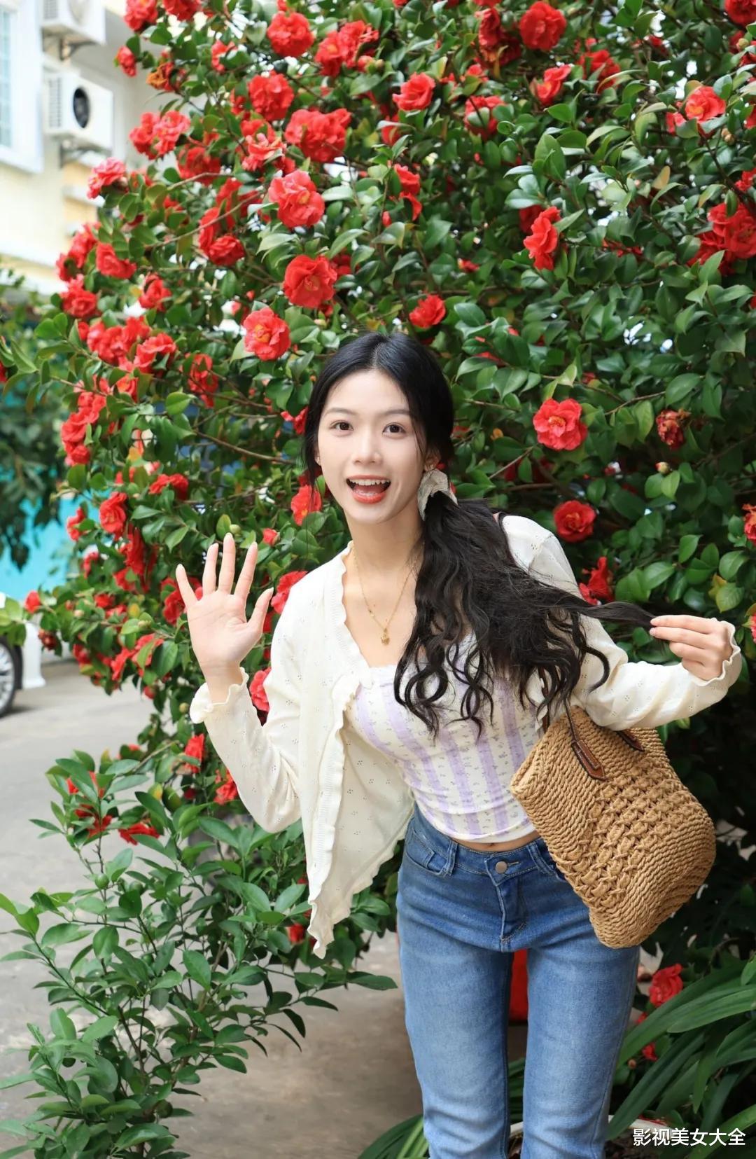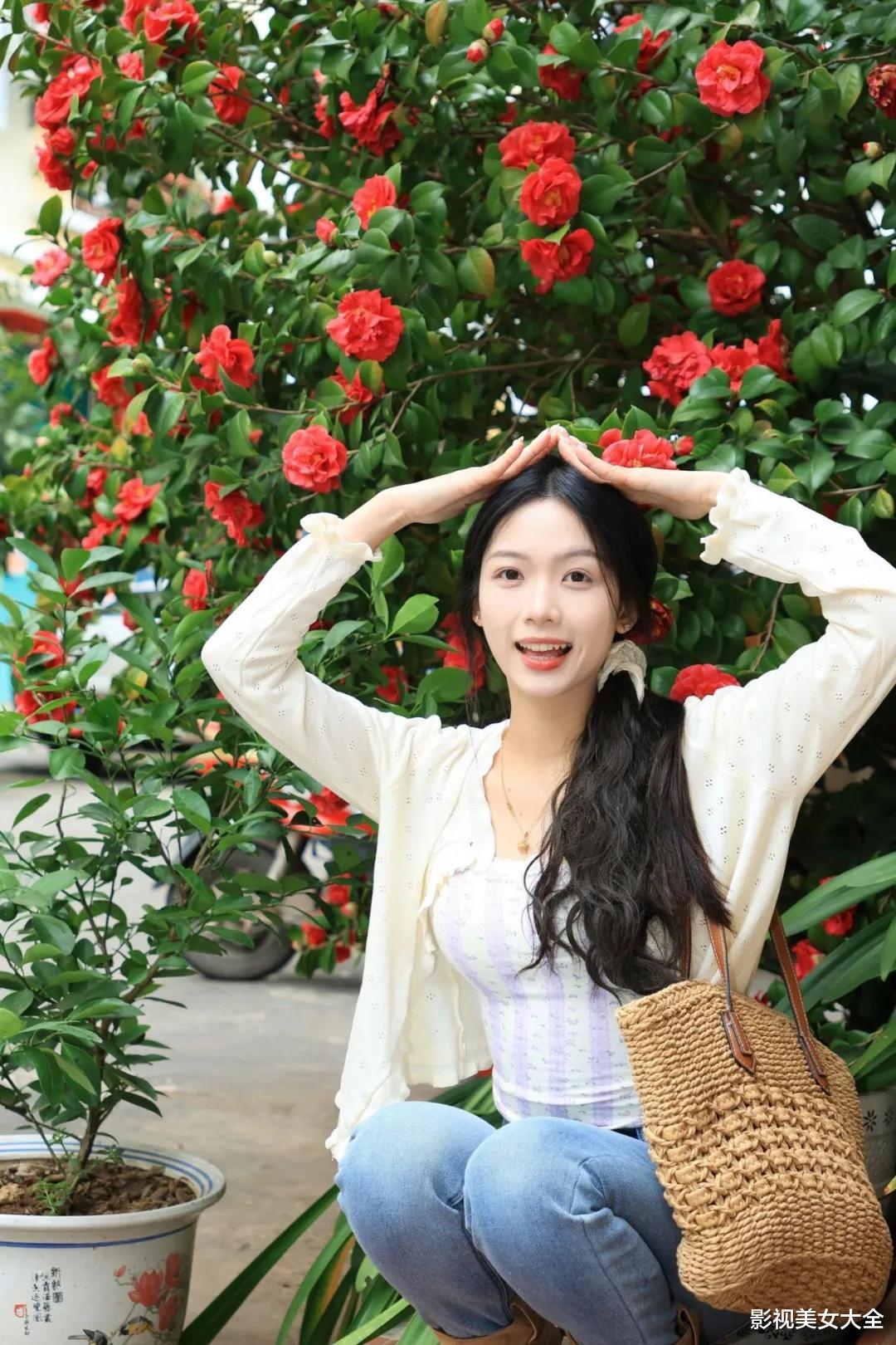 花墙拍照时正对镜头站好,双手手指轻轻戳在脸颊两侧,再自然地笑出来,这个拍照动作带点小俏皮,很适合想拍可爱风格的照片,成片效果会很出片也很漂亮。