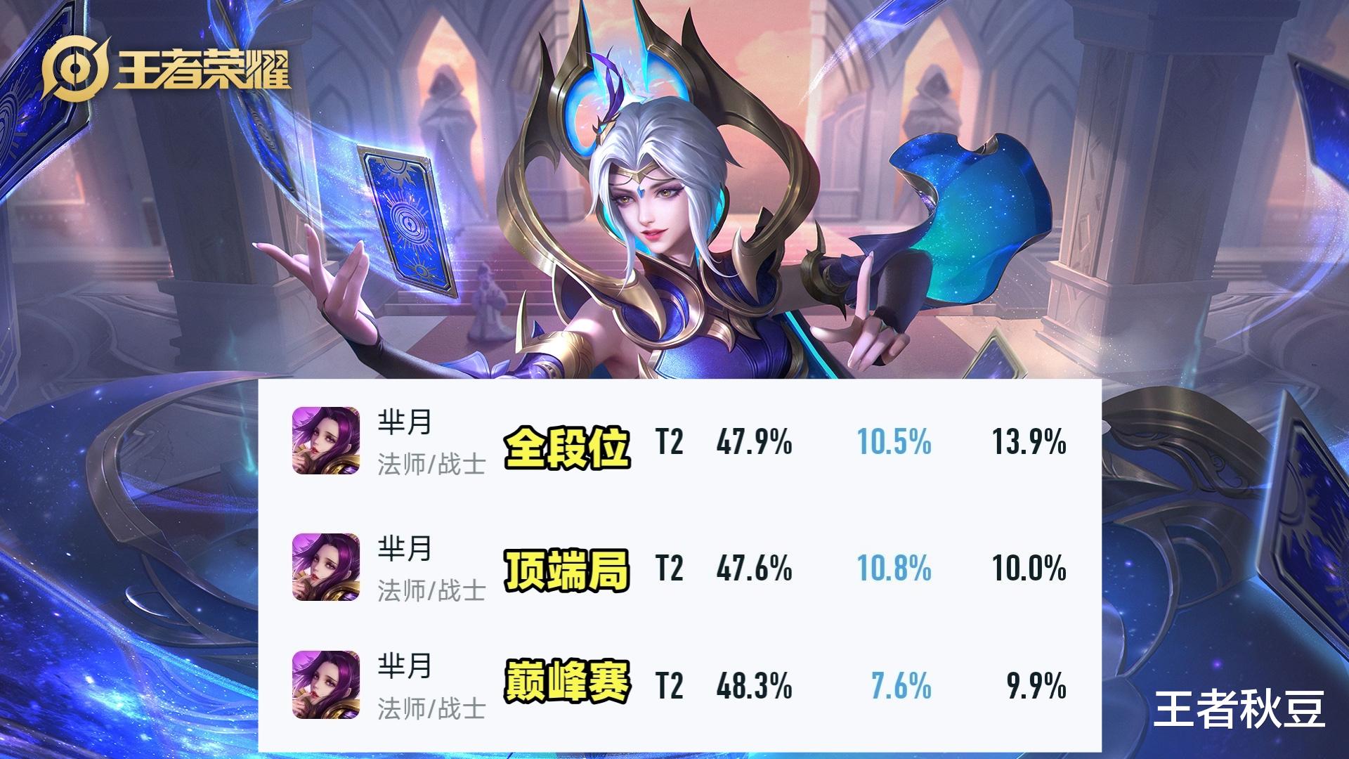 芈月首日胜率来看,不算太差,也不算太好。全段位胜率47.9%,登场率10.5%;顶端局胜率47.6%,登场率10.8%;巅峰赛胜率48.3%,登场率7.6%。从自身实战对局和观看各大国服芈月的直播效果来看,芈月实际感觉是变弱的。
