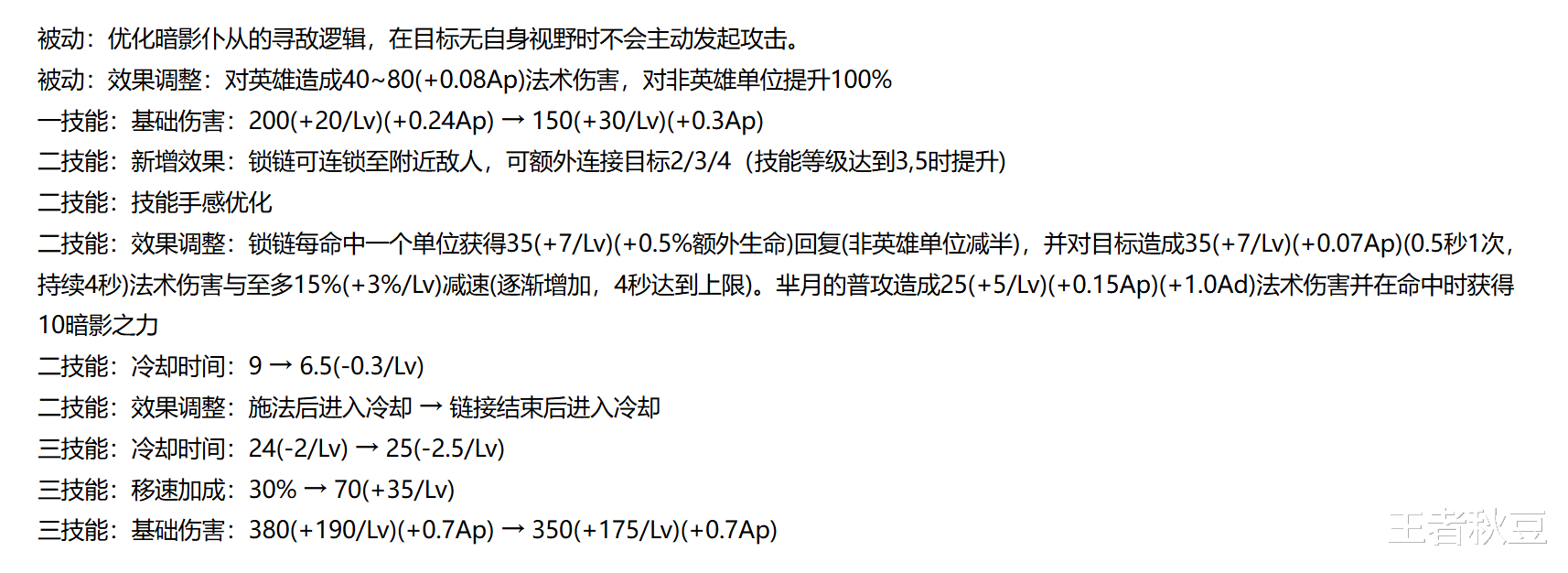 虽然公告上没写,但是移除了普攻暗影之力的10%减速效果。现在芈月的减速控制全靠二技能的链子,链子前期才15%的减速,满级也才30%。一旦二技能没命中,敌方就能大摇大摆离开芈月的输出范围。即便链中了,低减速下也很容逃脱。为了留人,已经有玩家开始出凝冰之息了。