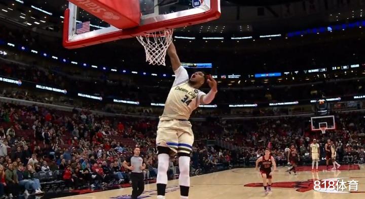 比赛进入最后10秒,公牛落后7分已经放弃了比赛,但是字母哥一人快攻秀了一波大风车扣篮,