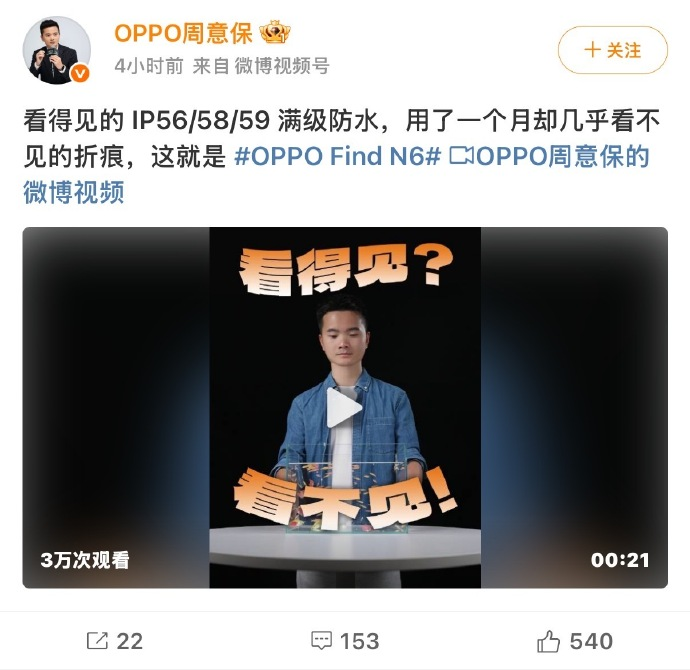周意保在最新视频中还展示使用一个月的OPPO Find N6,据其透露,用了一个月却几乎看不见的折痕,折叠屏完整体应该就是这样了吧?