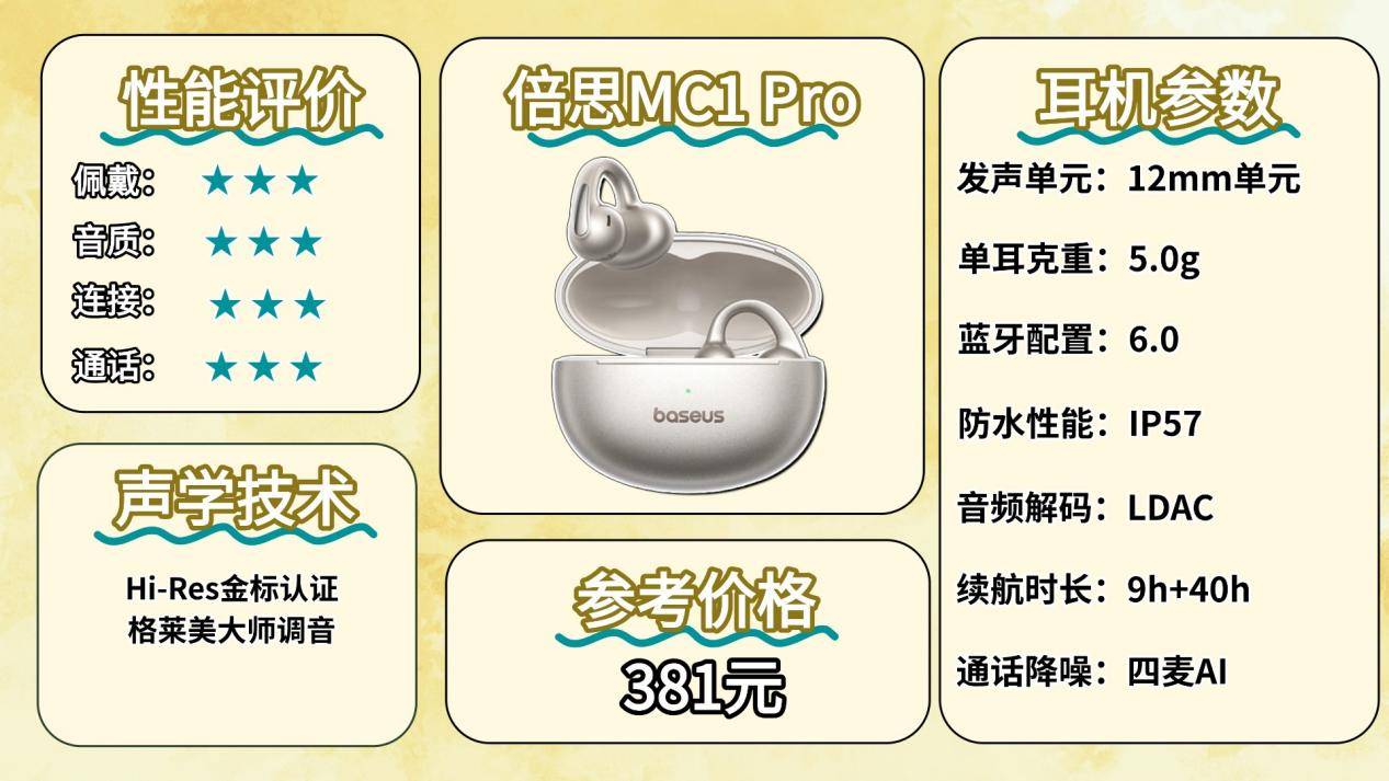 倍 思 M C1 P ro 主打轻量化结构,单耳约 5g,钛合金耳夹配合柔软气囊材质,佩戴时贴耳而不压耳,长时间使用也不容易产生疲劳感。因为耳挂线材比较纤细,在快速跑步时偶尔会出现轻微松脱,这点需要根据个人耳型做适当调整。声学部分用的是三磁路高灵敏单元,并通过了 Hi-Res 认证,中高频非常干净,适合细腻人声和轻设备类音乐;低频更多是点到为止,弹性有但厚度偏薄。