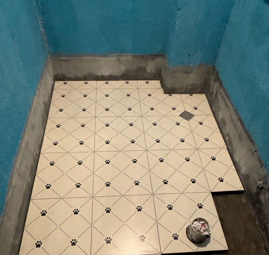 常见翻车:地砖平铺,地漏在缝边,积水3天褪不下去;标准做法:整砖对角切割,拼成回字,四角低、中间高;