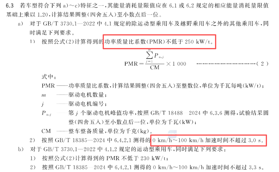 比如GB36980.1里面,就规定过关于“高性能车辆”的判定方法,使用的指标是功率质量比PMR,俗称推重比;计算方法也有明确的规定,是GB/T 18385。