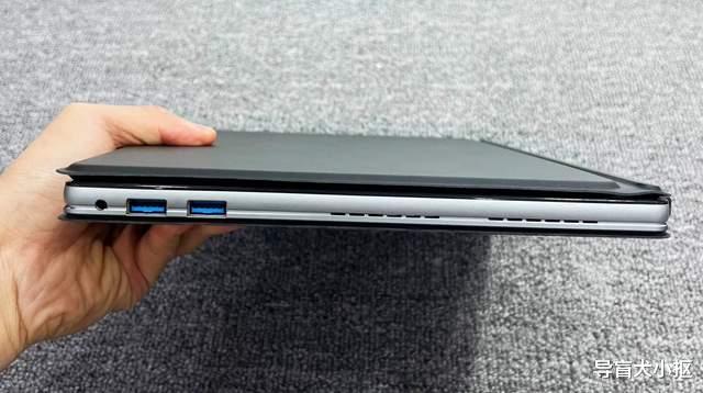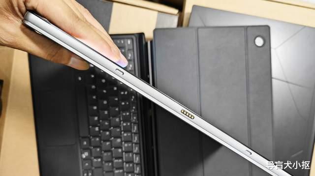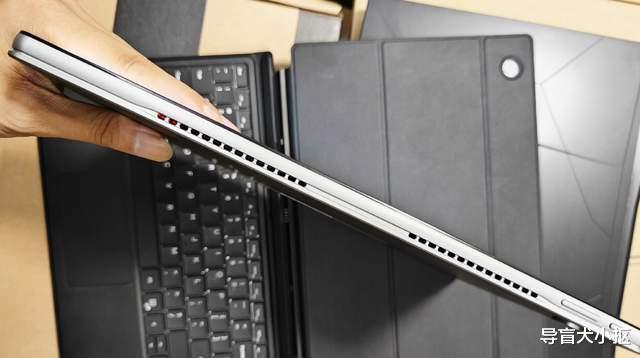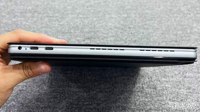 翻转平板到中框与后盖,S130的设计和传统安卓本子不同,回归到了win系统本子的风格,标志性的布局便是进气孔、散热孔等。像机身中框顶部是一排孔径,边缘处有电源、音量加减按键;中框左右侧对称布局了散热孔,孔径一样很大。在散热孔边缘集成了两个标准的usb3.1接口,两个全功能typec口,一个耳机孔一个圆孔充电口等。在中框底部,是熟悉的磁吸附键盘接口,与配套的键盘连接,一碰即连,正常操作使用,十分稳固,日常办公必备的搭档。