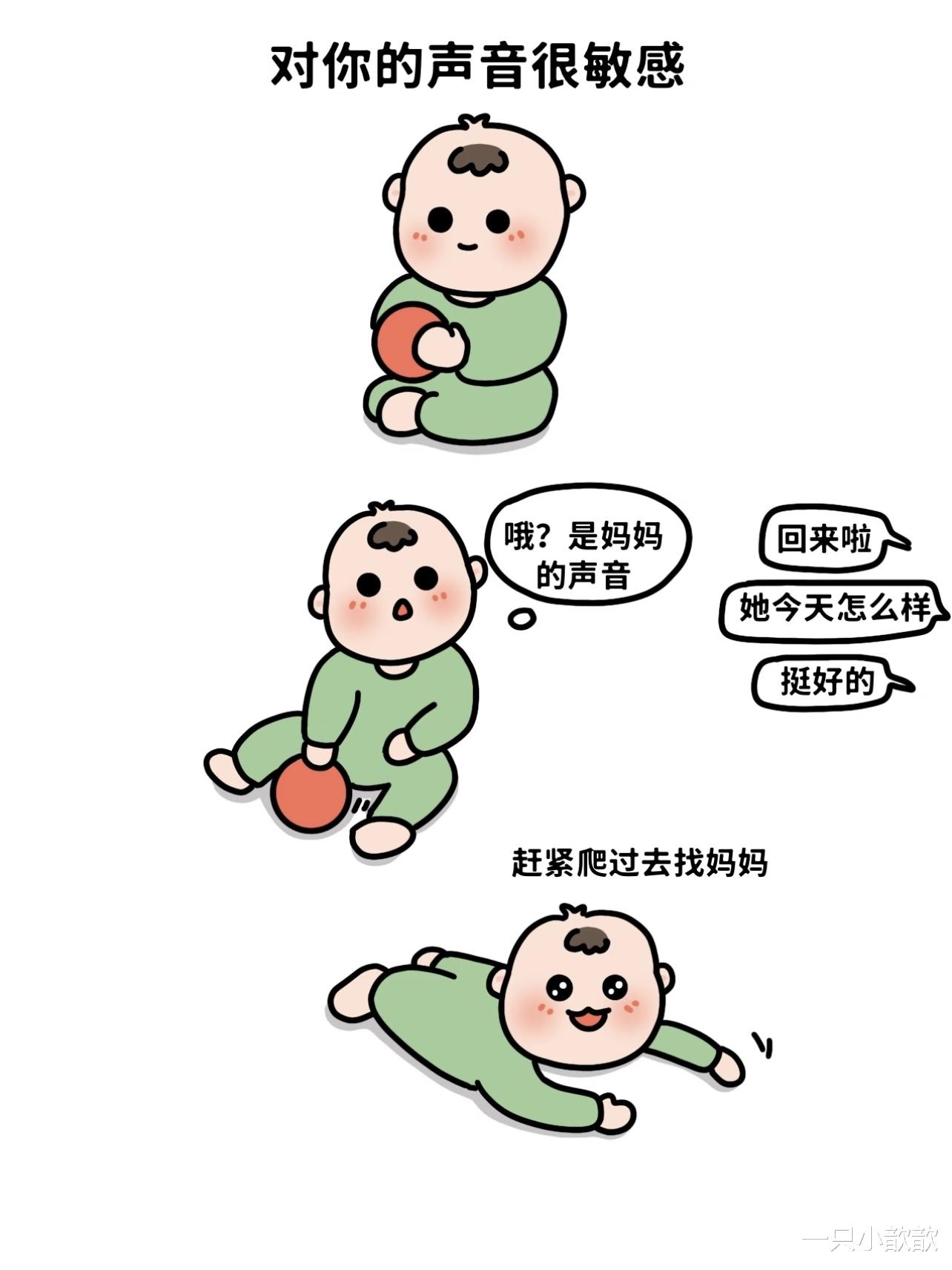 听到声音就找妈妈,宝宝对声音的敏感度也是逐渐提高的,当他开始认妈妈后,对妈妈的声音会特别熟悉和敏感,哪怕妈妈只是轻声呼唤他的小名,或者在他旁边说几句话,宝宝就会立刻转动小脑袋,四处寻找声音的来源。想象一下,你在另一个房间轻声哼着宝宝熟悉的摇篮曲,原本在床上自己玩耍的宝宝,听到你的声音后,会马上停止动作,竖起小耳朵仔细听,然后努力地朝着声音的方向扭动身体,想要看到你的身影,这种对妈妈声音的快速反应,就是宝宝认妈妈的有力证据。