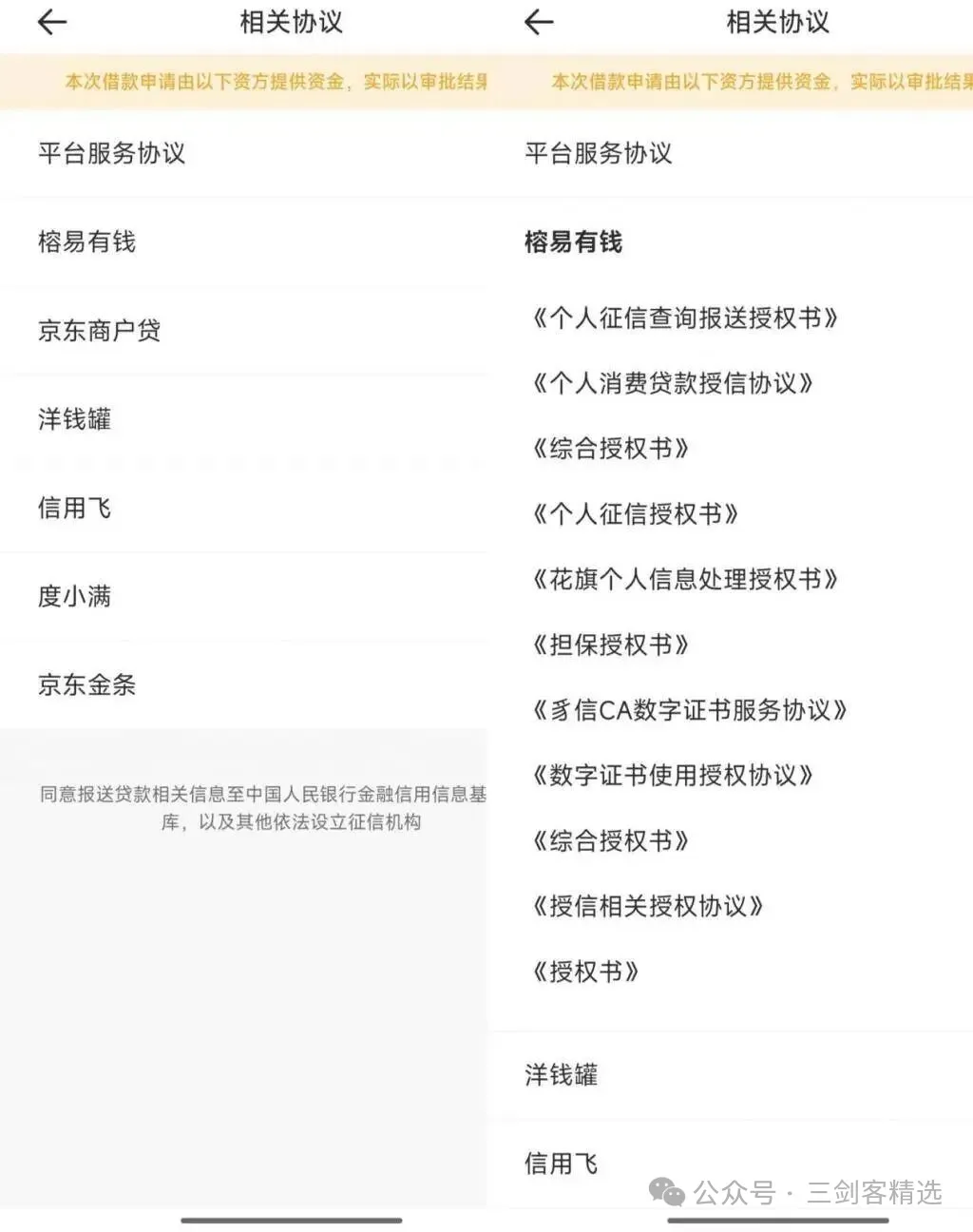 榕树贷款和钱小乐的《个人信息处理授权书》内容基本一致,同样没有第三方机构的具体名称,资金方也模糊处理,借款推荐服务方也用模糊指代。用不同手机号注册榕树贷款APP,出现的合作平台也不一致。助贷新规明确要求商业银行及互联网助贷业务合作机构应当加强金融消费者权益保护工作,规范营销宣传行为,向借款人充分披露相关关键信息,包括但不限于贷款主体等。但从榕树贷款和钱小乐的表现来看,其不够详尽的披露明显没有充分保障用户的知情权,让消费者在贷款过程中如同置身于迷雾重重的“黑箱”之中,无法清晰了解贷款相关的重要信息。