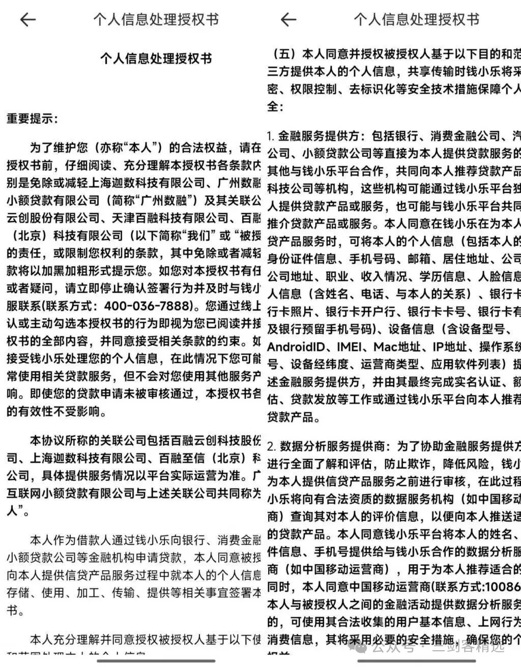 在实测过程中,发现榕树贷款和钱小乐的合作协议存在诸多不合规之处,其中信息披露不充分问题尤为突出。在钱小乐APP上注册,进行身份认证、输入紧急联系人和个人信息后,需要阅读并同意《授信申请授权协议》《个人信息处理授权书》《非在校学生承诺函》三份协议。其中《授信申请授权协议》的“平台服务协议”内仅包含一份《个人信息处理授权书》,提到借款人同意被授权人在向其提供信贷产品服务过程中就个人信息相关事宜签署本授权书,但被授权人除包括百融云创股份科技有限公司等关联公司外,银行、消费金融公司、小额贷款公司具体分别是哪些机构却未提及。