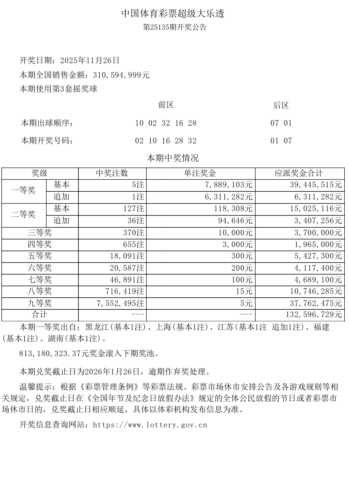 体彩超级大乐透②⓪②⑤135期开奖信息