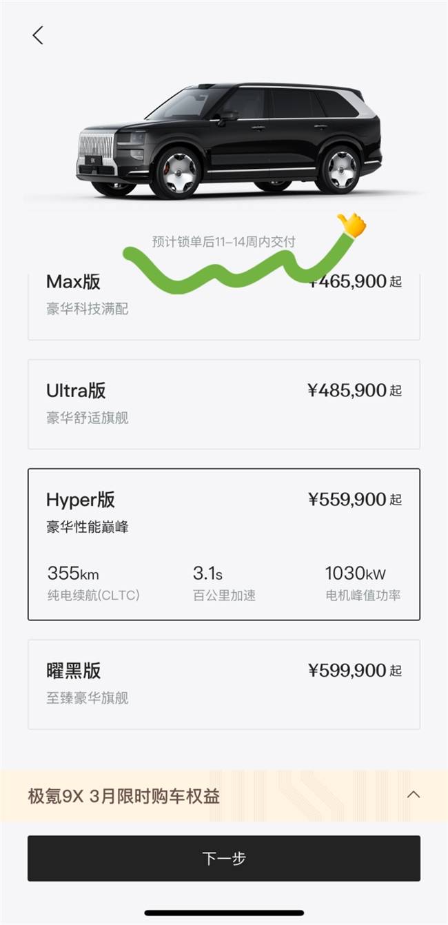 极氪9X Hyper版的提车周期缩短到11-14周了,现在核心零部件的产能翻倍,交付周期比之前快了7周不止