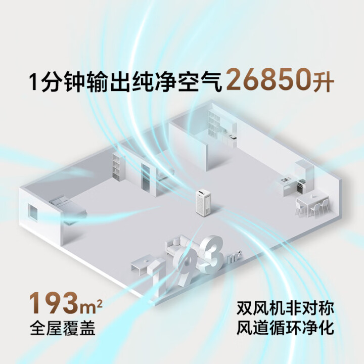 颗粒物 CADR 实测1610.1m³/h、甲醛CADR 1092m³/h,193㎡的别墅单层1小时可完成19.2次空气置换,让客厅、卧室、书房甚至地下室都能同步享受到洁净空气;