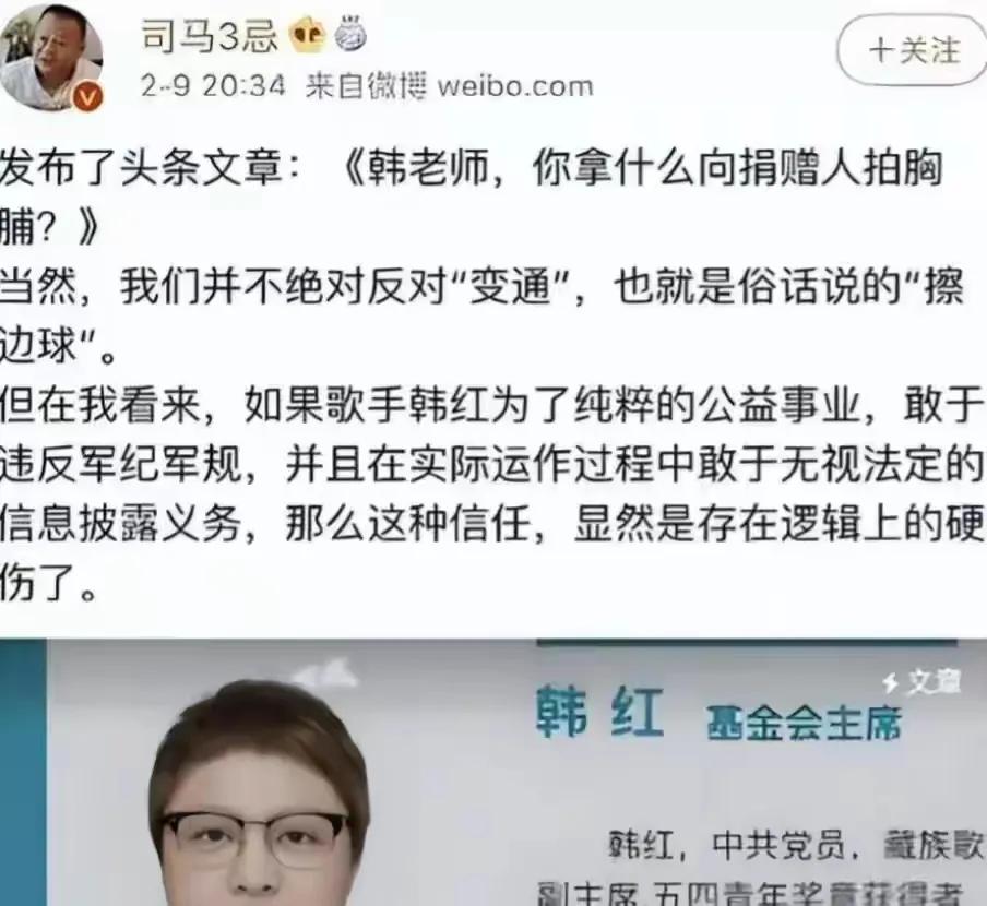 故事要从2020年初的特殊时期说起。彼时全民抗疫,韩红第一时间发起捐款,带着基金会冲在前线,将物资和资金源源不断送到需要的地方。可高强度的奔波让她无暇及时公示捐赠手续,这个“疏忽”被别有用心之人抓住——“司马3忌”实名举报她“贪污善款”,一时间“假慈善”的帽子铺天盖地压来。