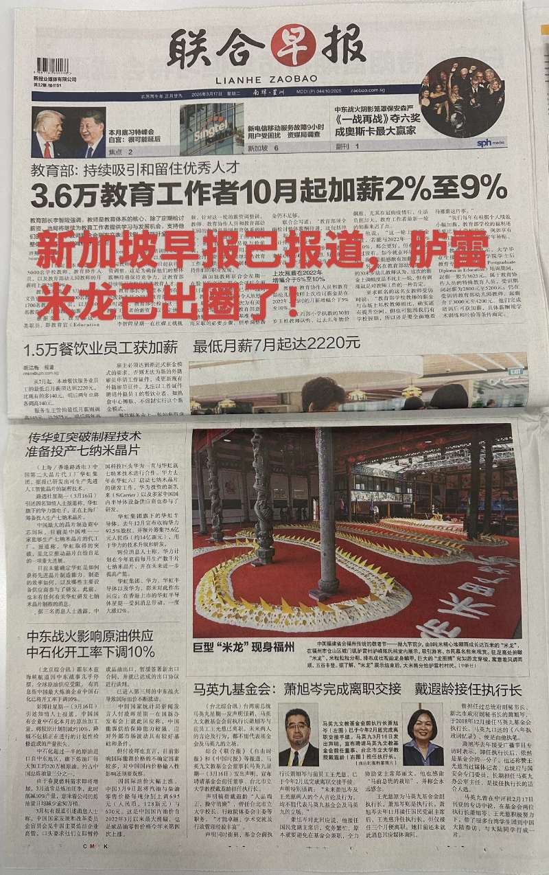 3月17日的新加坡《联合早报》报道百米米龙庆拗九节敬老活动