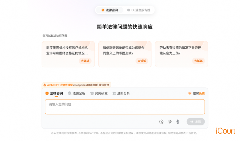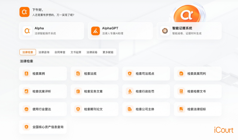 AlphaGPT是iCourt自主研发的法律垂直领域大模型,2025年2月8日完成与DeepSeek的深度融合。作为首个“DeepSeek+法律专业”的垂域AI模型,AlphaGPT在同年5月7日通过《生成式人工智能服务管理暂行办法》备案,成为首批具备“合规编制”资质的法律AI工具。该模型不仅涵盖检索、审查、文书、阅卷等核心功能,还是一套面向律师、律所与法务的法律AI工作流体系,旨在将法律人从重复性劳动中解放出来,专注于高价值判断。