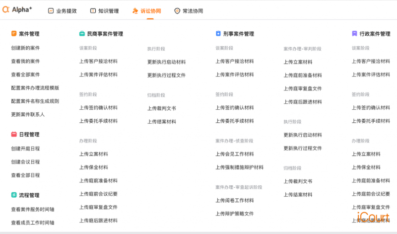 iCourt围绕法律工作的核心需求,打造了多个标志性产品:AlphaGPT提供一站式协同办公、业务提效工具和深入法律服务场景的AI能力,Alpha系统提供坚实的法律数据基础,AlphaAI工具则通过知识库打通数据、工具与协作,构建一体化的智能工作平台。下面我们将逐一解析这些产品的核心功能与独特价值。