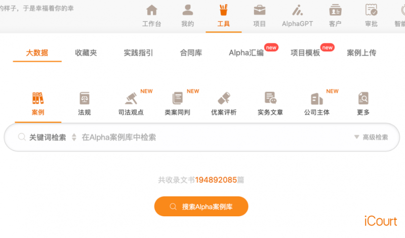 如果说AlphaGPT是律师的智能办案伙伴,那么Alpha系统则是支撑其高效运转的“数据基石”。作为法律智能操作系统,它构建了覆盖全面、权威可靠的法律信息,为所有检索需求提供了坚实的数据支撑。
