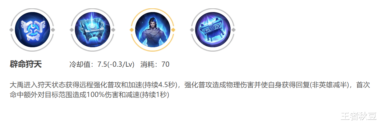 强化:大禹释放二技能后将变成远程普攻形态和加速效果,适合拉扯。(由于一技能很短,需要二技能强化加速才好命中)