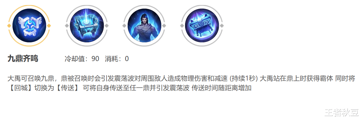 传送:大禹学习大招后回城将切换成传送,可以在鼎和鼎之间传送,传送距离无限制,可全图传送。