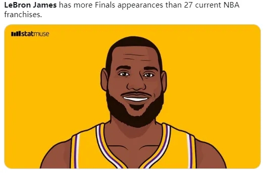 詹姆斯参加总决赛次数(10次)超过NBA目前27个球队,仅比湖人(32次)、凯尔特人(21次)和勇士(11次)少。湖人此前31次总决赛16次夺冠。