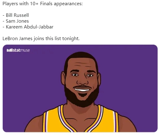 NBA历史上总决赛10+球星,詹姆斯加入比尔-拉塞尔(12)、萨姆-琼斯(11)和贾巴尔(10)行列;此前9次总决赛,詹姆斯3次捧杯
