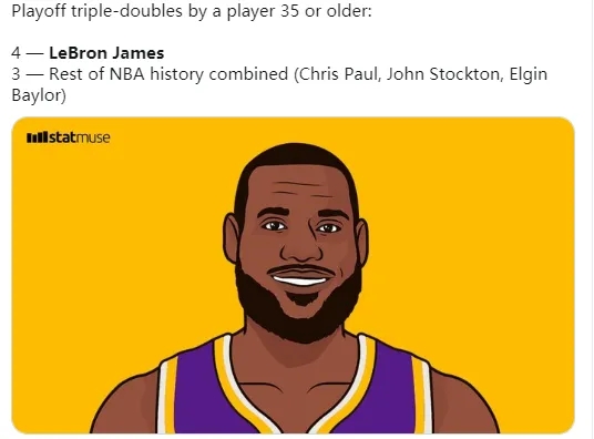 季后赛35岁及以上砍下三双次数,詹姆斯一人4次,其他三人(保罗、斯托克顿和贝勒)各一次