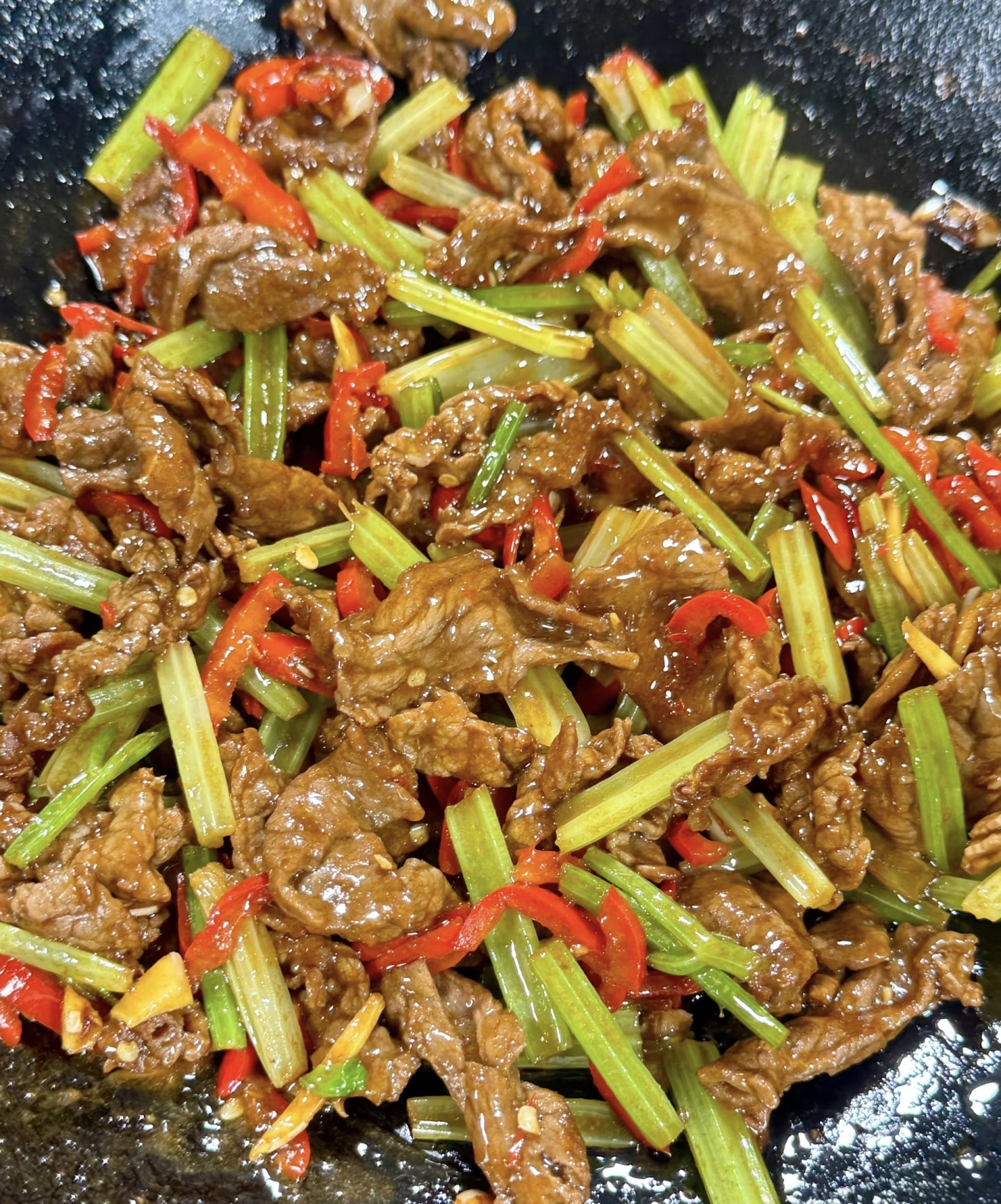 热锅凉油,油温五成热(筷子插进去冒小泡)时,下牛肉片快速滑散。看到肉片变色立刻盛出来!别贪心多炒,不然牛肉会“生气”变老的!锅中倒油,油热下芹菜段,开大火翻炒1分钟,炒到芹菜边缘微微透明,像刚洗完澡的皮肤一样水润。把滑好的牛肉倒回锅里,加半勺生抽、少许盐和糖(糖是提鲜的秘密武器!),快速翻炒均匀。记住:全程大火!这样牛肉和芹菜才能保持鲜嫩!出锅前淋点香油,撒把葱花(没有也行),翻炒两下,关火!一盘香到邻居来敲门的芹菜炒牛肉,完成!