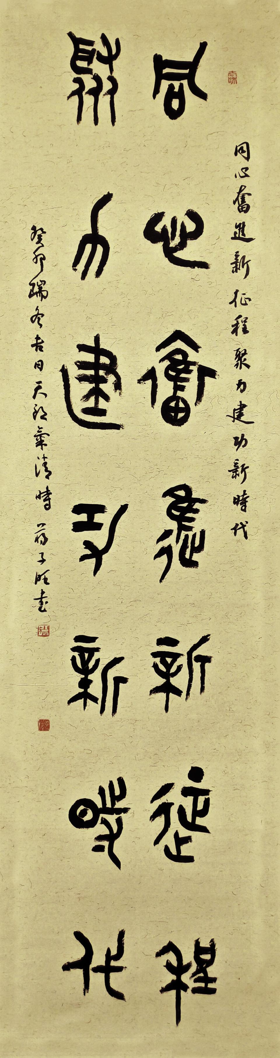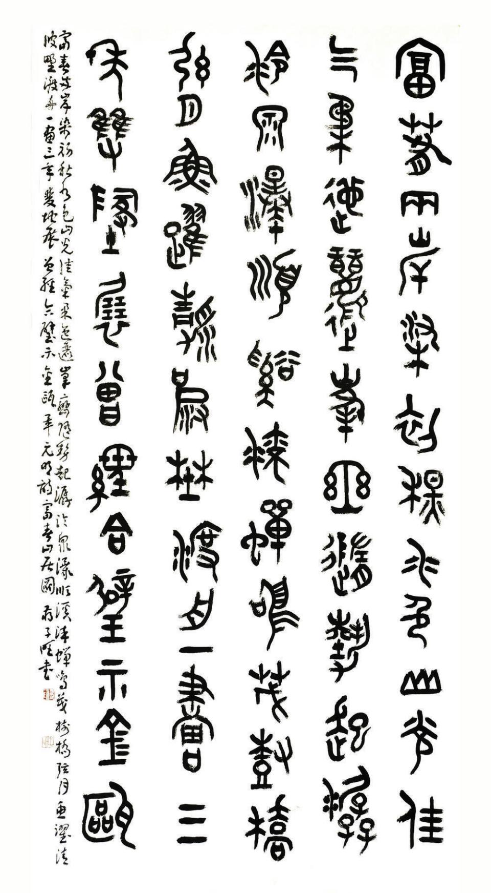 蒋子旺是年轻一代书法家中,致力于篆书的学习、创作与研究并取得优异成绩者。其篆书以西周中、晚期金文风格为基调,线条厚实中见生动,结体端庄中见变化,通篇布局主次分明,疏密有致。