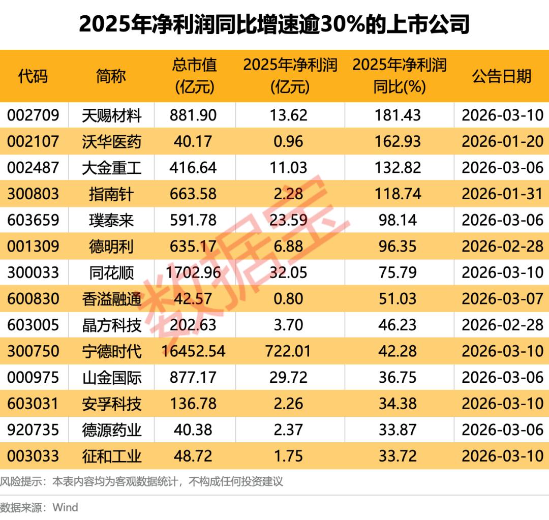 截至3月9日,已有47家A股上市公司发布了2025年年度报告。从净利润规模来看,共计21家全年净利润在3亿元以上。宁德时代、中兴通讯、同花顺暂列前三,净利润依次为722.01亿元、56.18亿元、32.05亿元;山金国际、*ST松发、德赛西威、璞泰来净利润均在20亿元以上。