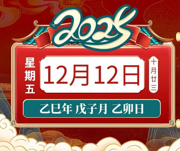2025年12月12日,星期五,农历十月廿三 (乙巳年戊子月乙卯日),法定工作日。红榜生肖:狗、猪、羊需要注意:鼠、龙、
