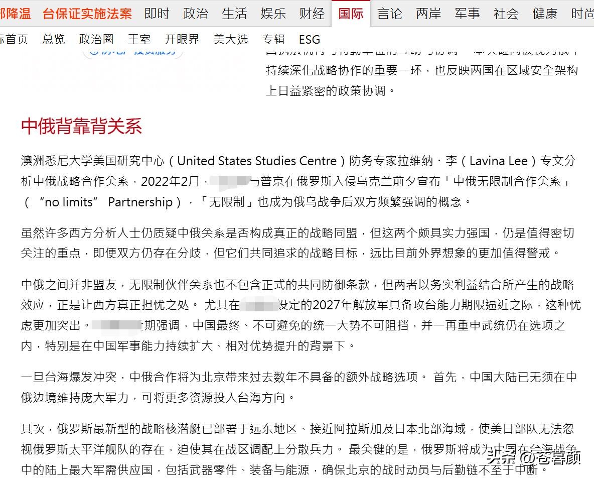 一些台湾媒体引用澳大利亚专家的深度分析,勾勒出了一幅令“台独”分子窒息的画面,在这些专家的推演中,尽管中俄不是正式军事盟友,但这种“背靠背”的战略互信,足以在未来的统一战中转化为实实在在的战争优势。