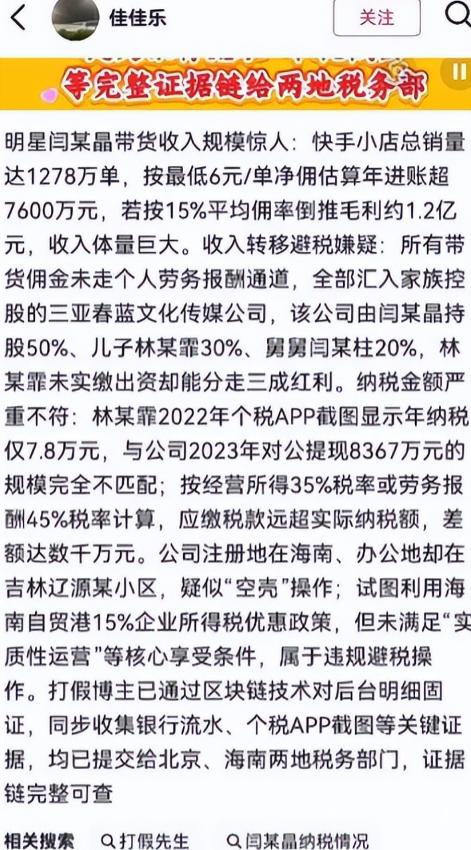 有一个打假博主,公开实名举报闫学晶收入和纳税严重不符,更是直接向北京和海南两地的税务部门提交了材料。