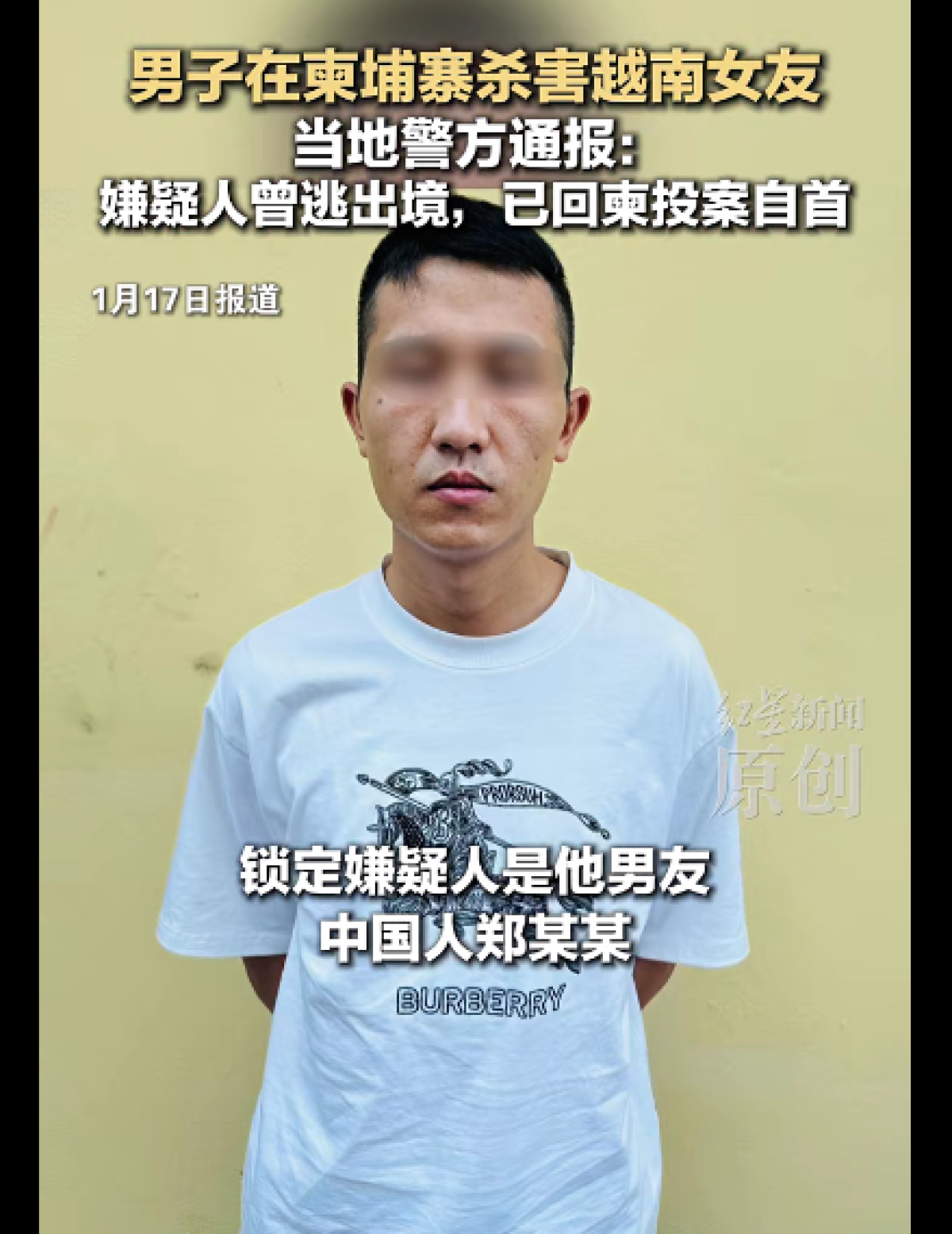 案发后,郑某某逃到越南,1月11日返回柬埔寨向警方自首。警方称,案发前这对情侣发生争执,导致嫌疑人使用暴力袭击。