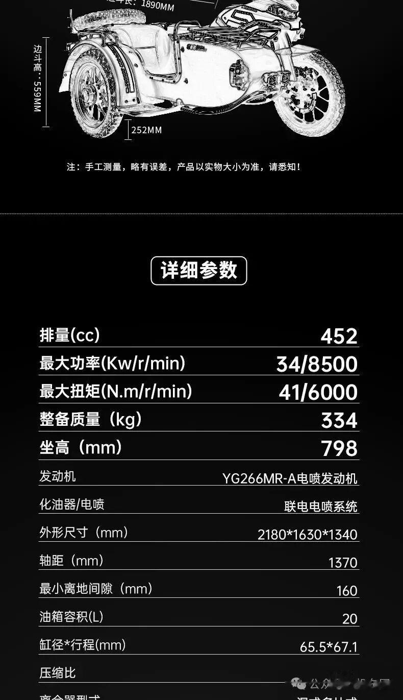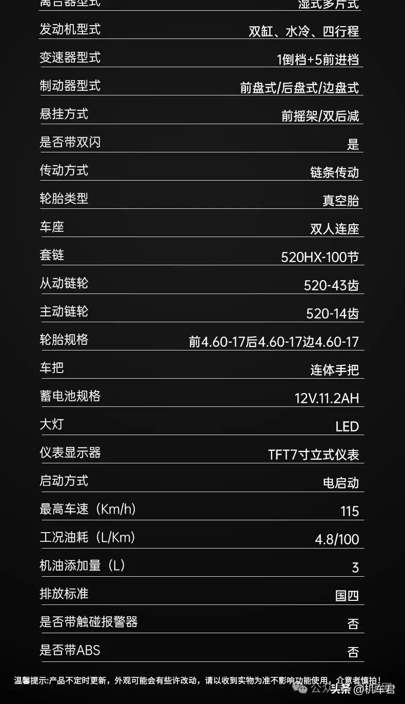 整备质量334kg;油箱容量20L;前后单碟双活塞卡钳,边斗单活塞卡钳,CBS联动刹车。前摇架式减震,后双枪减震;7寸TFT竖屏仪表;全车LED光源,透镜大灯+雾灯+高亮射灯。