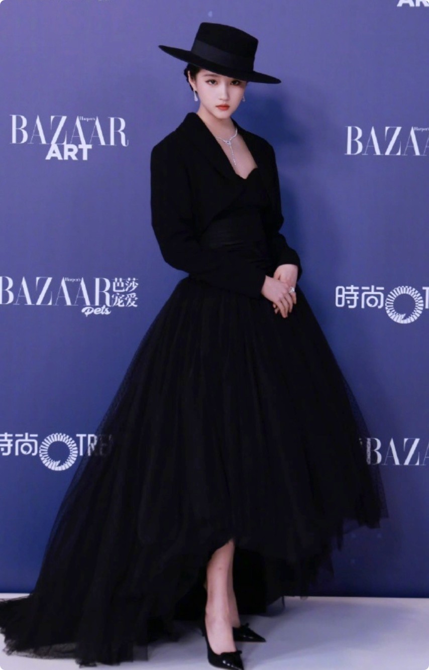 她身着一条剪裁独特的黑色纱裙,层层叠叠的裙摆既有纱裙的柔美,又带着几分酷帅感。