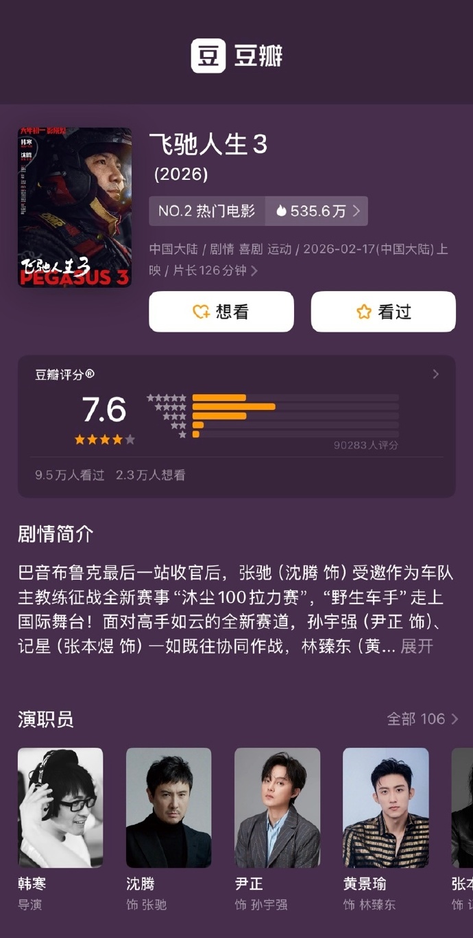 另一个争议点是“全程无女主”。有人吐槽“连个女性角色都没有”,也有网友直言:“韩寒本就不擅长写女性戏份,干脆彻底不拍,主打一个坚持自我。” 沈腾、尹正、魏翔、张本煜的纯爷们战队,不搞爱情线,只讲兄弟与热爱,反而精准戳中中年观众的情怀。