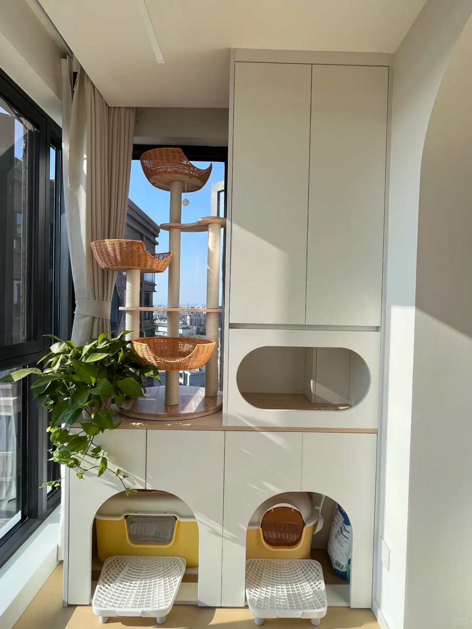 在阳台角落做了宠物专属区,定制了隐藏式猫砂盆柜,旁边放了猫爬架、猫抓板,还有一整面柜子收纳零食和生活用品,猫咪能在这玩、能睡觉、能上厕所,家里再也没有猫砂散落,颜值也超棒。