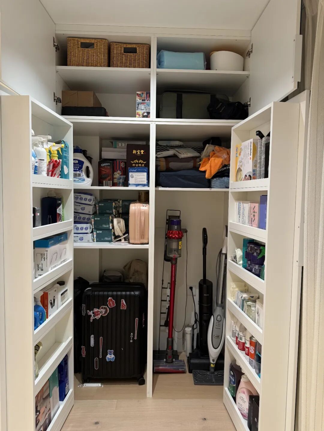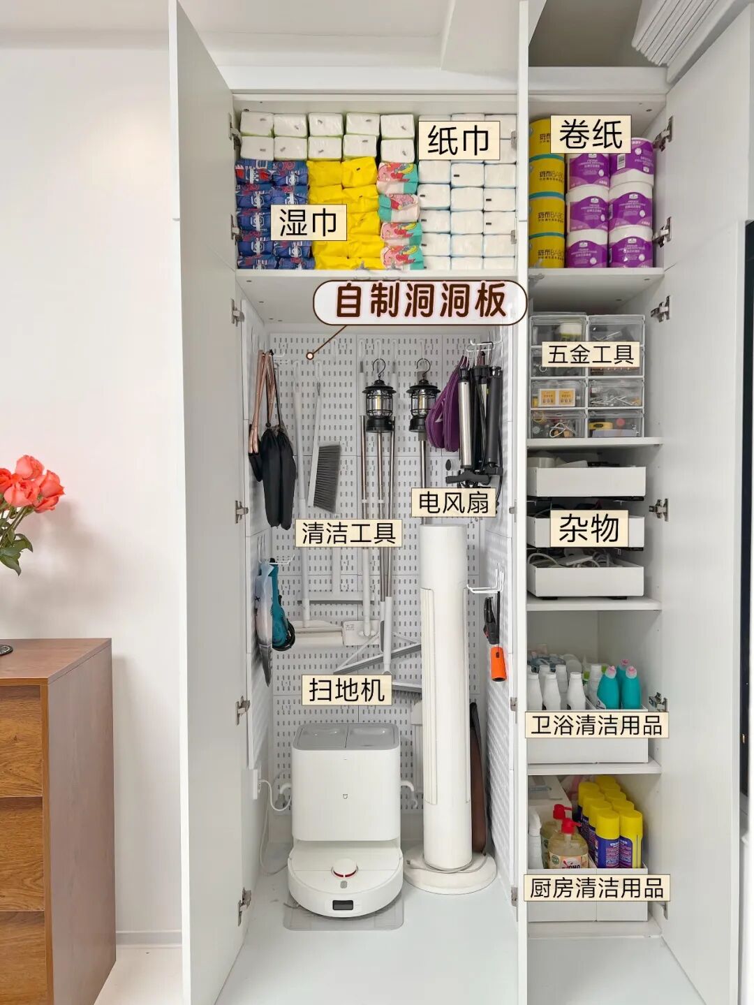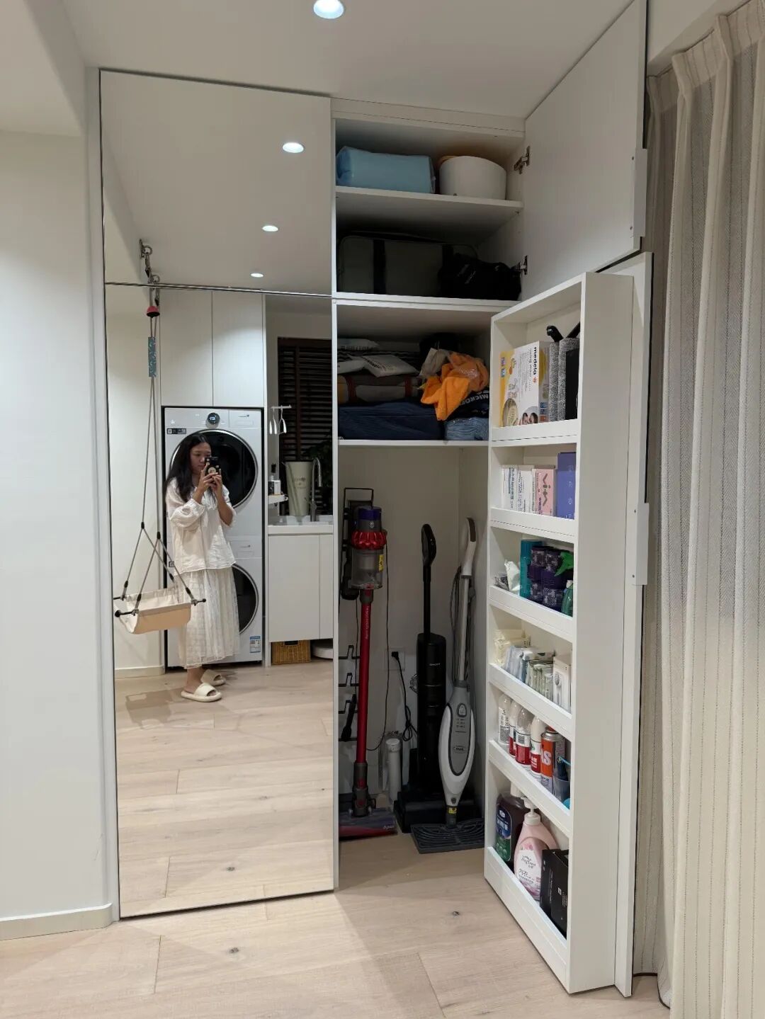 我家阳台就做了冰箱式家政柜,一格底下无底板放洗地机等重型清洁工具,上层可以用来囤物,柜门还可以收纳清洁用品,所有清洁、维修工具一站式收纳。