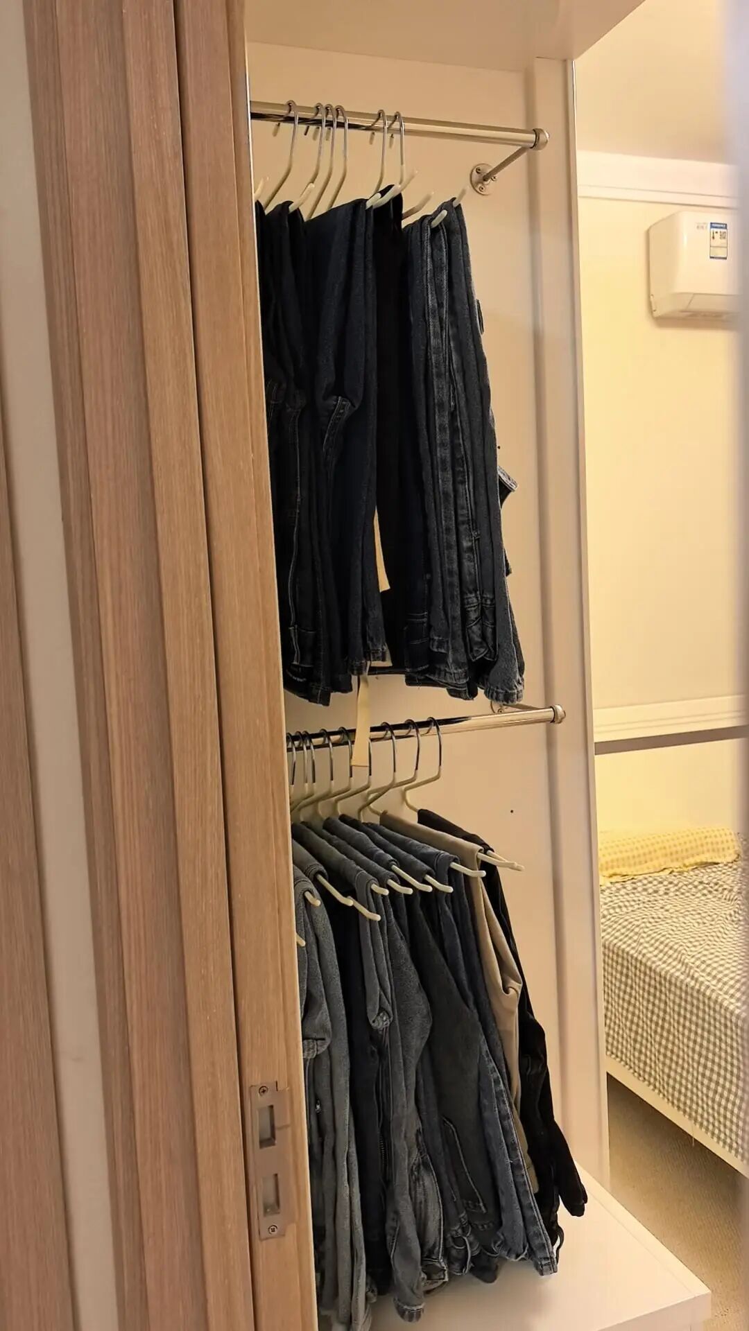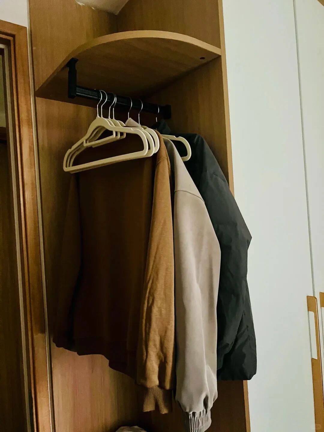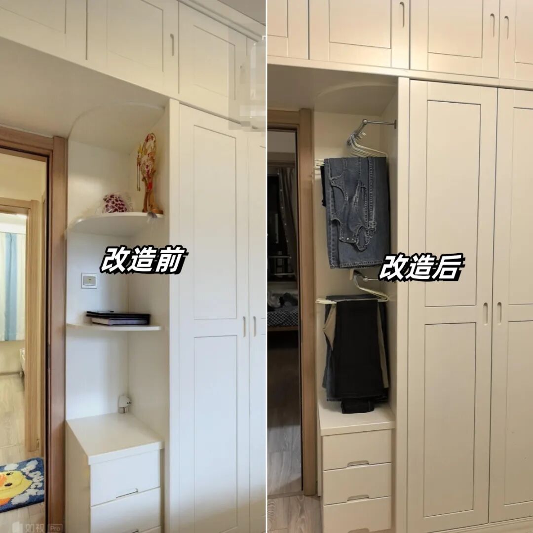 我把衣柜圆弧柜改造成了次净衣区,穿了一天的衬衫、裤子随手挂旁边,和衣柜里面的干净衣服完全分开,早上起床找衣服也不用翻,方便太多了!