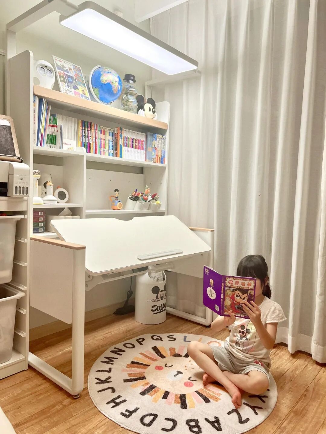我家为女儿在房间设计了一个学习区,定制了学习桌椅,旁边摆个小书架放打印机,绘画本,还有文具收纳盒,东西各归其位,孩子写作业再也不东找西找,效率高多了!